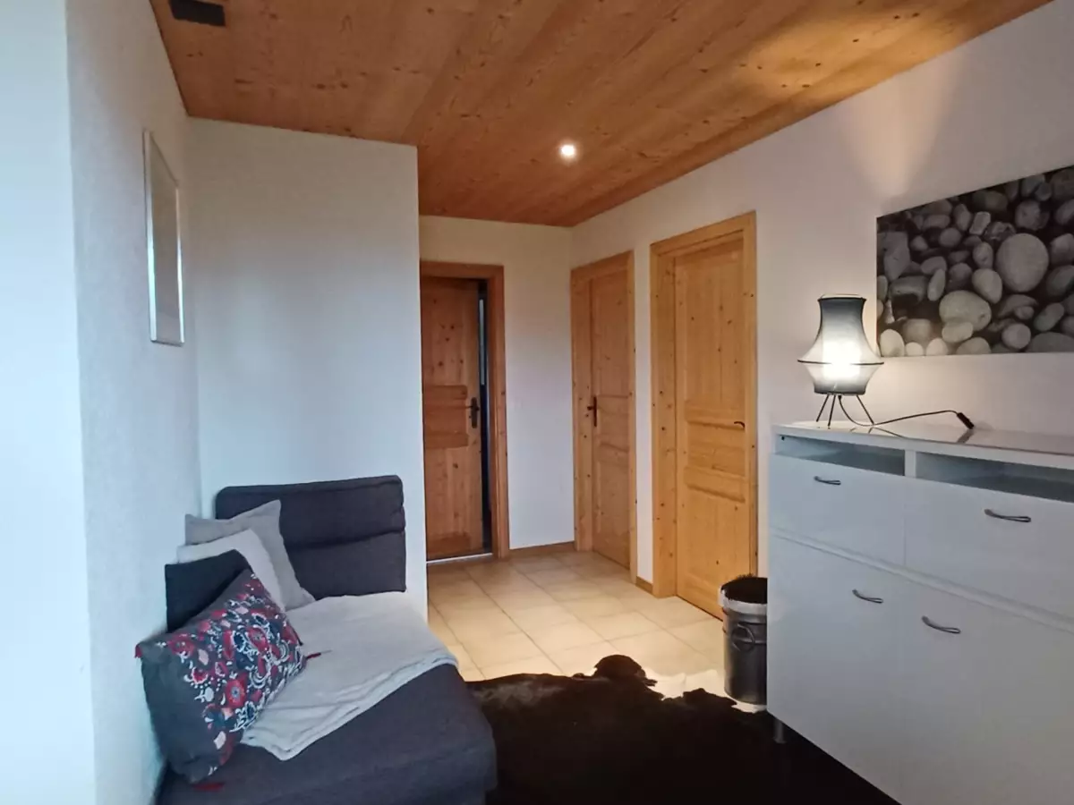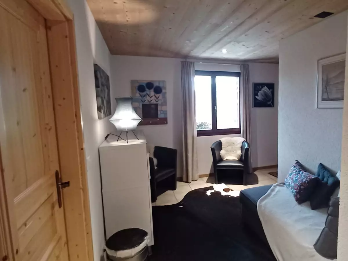 • 1 séjour / salle à manger avec cheminée et coin repos (cageot de bois à disposition pour CHF 10.-) – canapé 3 places – fauteuil - radio DAB – lecteur DVD - enceinte bluetooth - table avec rallonge – chaises - sortie sur terrasse